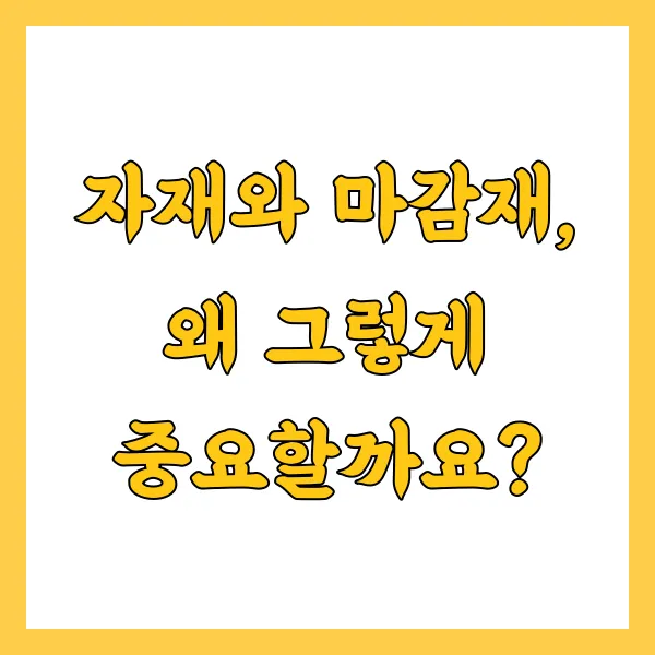 자재 선택은 한 번 결정하면 바꾸기 쉽지 않기 때문에 신중해야 해요. 그래서 오늘은 여러분이 후회 없는 선택을 할 수 있도록, 다양한 자재와 마감재에 대한 정보와 함께, 예산을 효율적으로 관리하는 꿀팁까지 아낌없이 알려드릴게요! 자, 그럼 이제 본격적으로 자재와 마감재의 세계로 함께 떠나볼까요?